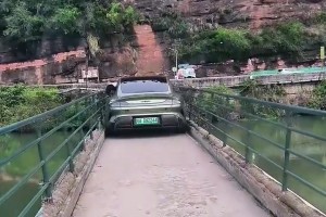 车主小心翼翼过韶关牛鼻村窄桥,小车擦着护栏过,车轮贴着桥边转